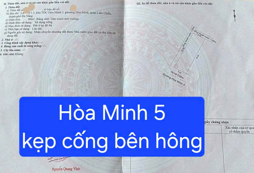 – Hòa Minh, Q Liên Chiểu, TP Đà Nẵng – Diện tích: 80m2 (5×16)m – Lô đất lề lô góc lại kẹp cống bên hông xây nhà rất thoáng – Đường 5.5m, lề 3m – Vị trí: Gần biển, nằm sát gó đường Hồ Tùng mậu, gần UBND Quận, xung quanh toàn nhà cao tầng, khu phố dân trí cao, an ninh tốt. Gía: 4,55 tỷ |